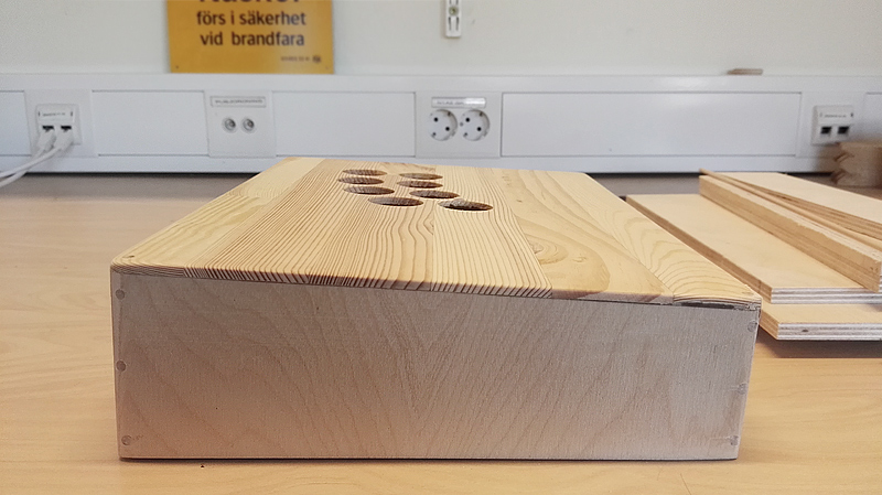 Calosc wykonalem w drewnie. Scianki to wysokiej jakosci sklejka, a gorny panel to plyta parkietowa, ktora zredukowalem do grubosci 4mm. Wiekszosc wlasnej produkcji stickow, a dokladniej tych, ktore wykonane sa z litego drewna, jest dosc masywna. Poczatkowo obawialem sie, ze bede musial calosc sztucznie dociazyc. Na szczescie okazalo sie, ze zabieg ten byl zbedny.