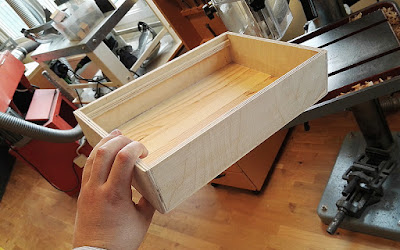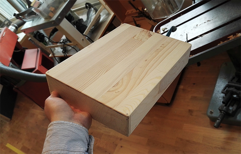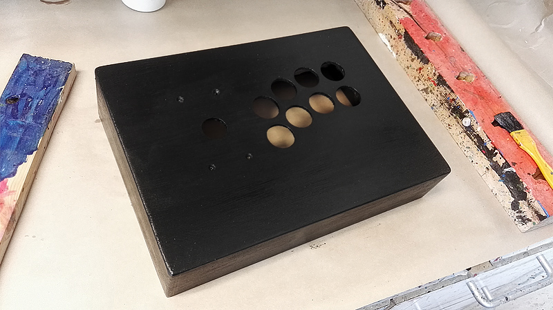Budowa skrzynki byla dosc przyjemnym zadaniem. Calosc zbilem przy pomocy drewnianych kolkow, a wszystkie powierzchnie kontaktowe pokrylem klejem. Gdy skrzynka byla gotowa, zaokraglilem wszystkie brzegi i wypolerowalem powierzchnie na jedwab. W koncu przyszedl czas wiercenia otworow na przyciski i galke. Przy tym zabiegu zaciskalem zeby rownoczesnie modlac sie, zeby wzglednie delikatne drewno nie peklo pod wplywem wibracji.